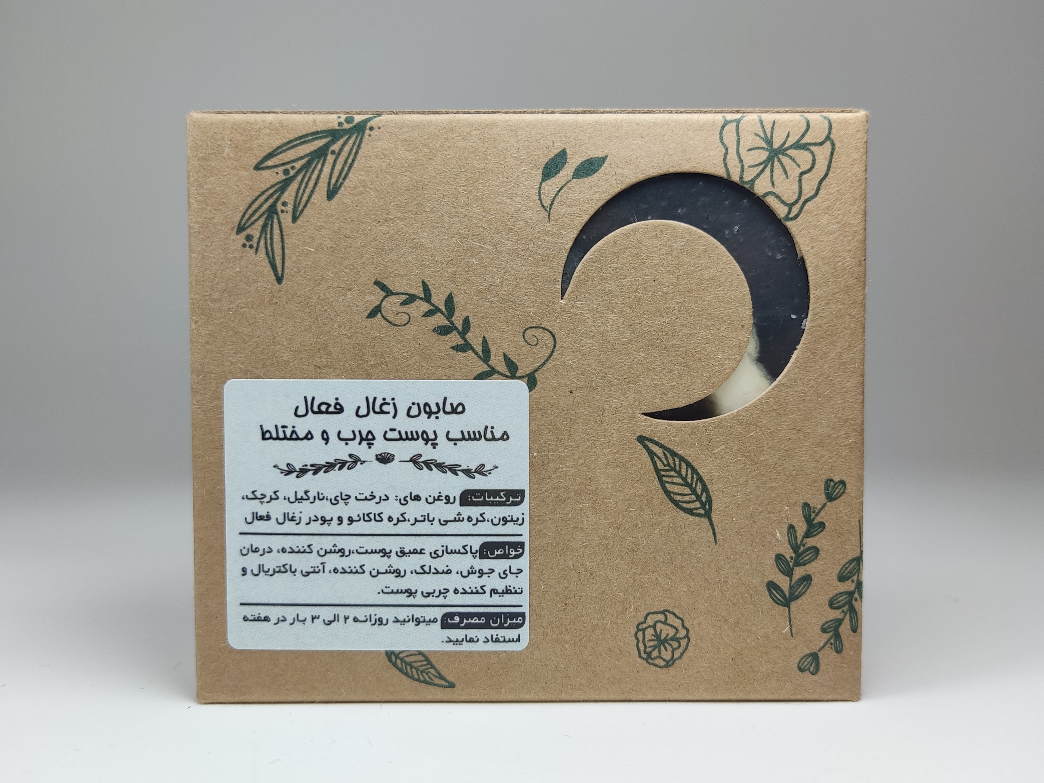 مواد تشکیل دهنده : روغن نارگیل ، روغن زیتون ،روغن درخت چای ، روغن کرچک ، کره شی باتر ، کره کاکائو ، پودر زغال فعال